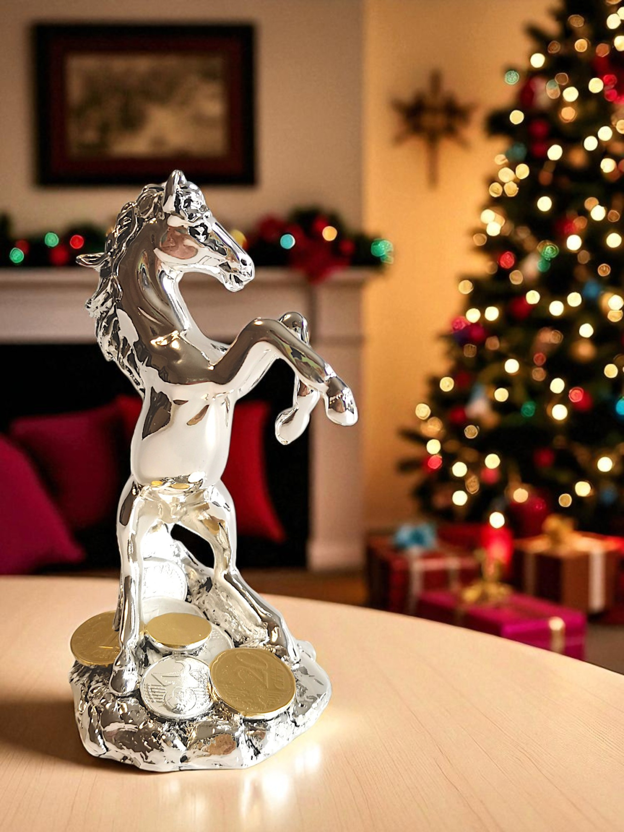 Посеребренная статуэтка высотой 12 см выполнена с филигранной точностью, подчеркивающей грациозность и силу лошади. Искусно выполненные монеты символизируют богатство и финансовый успех, которые обязательно придут в ваш дом с этим элегантным символом года.