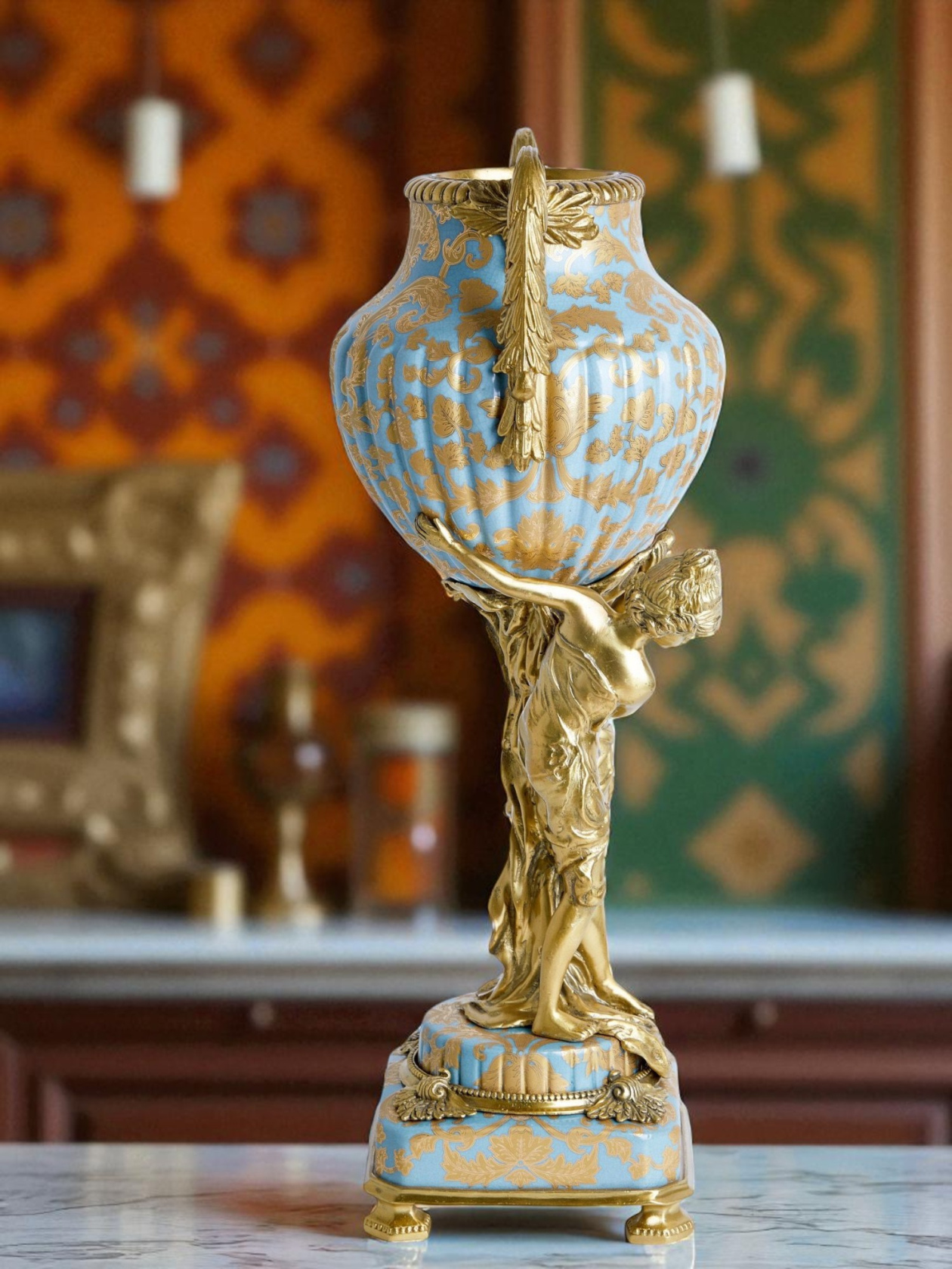 Эта великолепная декоративная ваза с необычным бронзовым литьём в виде двух Граций, несущих чашу, выполнена в соответствии с вековыми традициями лучших мастеров фарфора, эффект старения достигается использованием эксклюзивной технологии создания видимых трещин (крекелюров). Только ручная работа, и фарфор и литьё выполнены исключительно в ручную по старинным эскизам. Высота 48 см