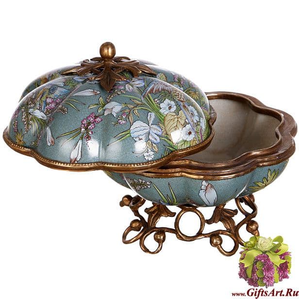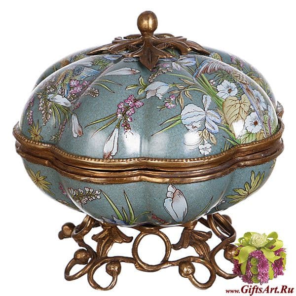 Эта великолепная ваза-кофетница из Коллекции Идеальный мир оригинальной формы декорирована бронзовой композицей, выполнена в соответствии с вековыми традициями лучших мастеров фарфора. Вы можете использовать и как шкатулку под милые сердцу мелочи. Эффект старения достигается использованием эксклюзивной технологии создания видимых трещин (крекелюров). Только ручная работа, и фарфор и литьё выполнены исключительно в ручную по старинным эскизам. Высота 11 см Длина 16 см
